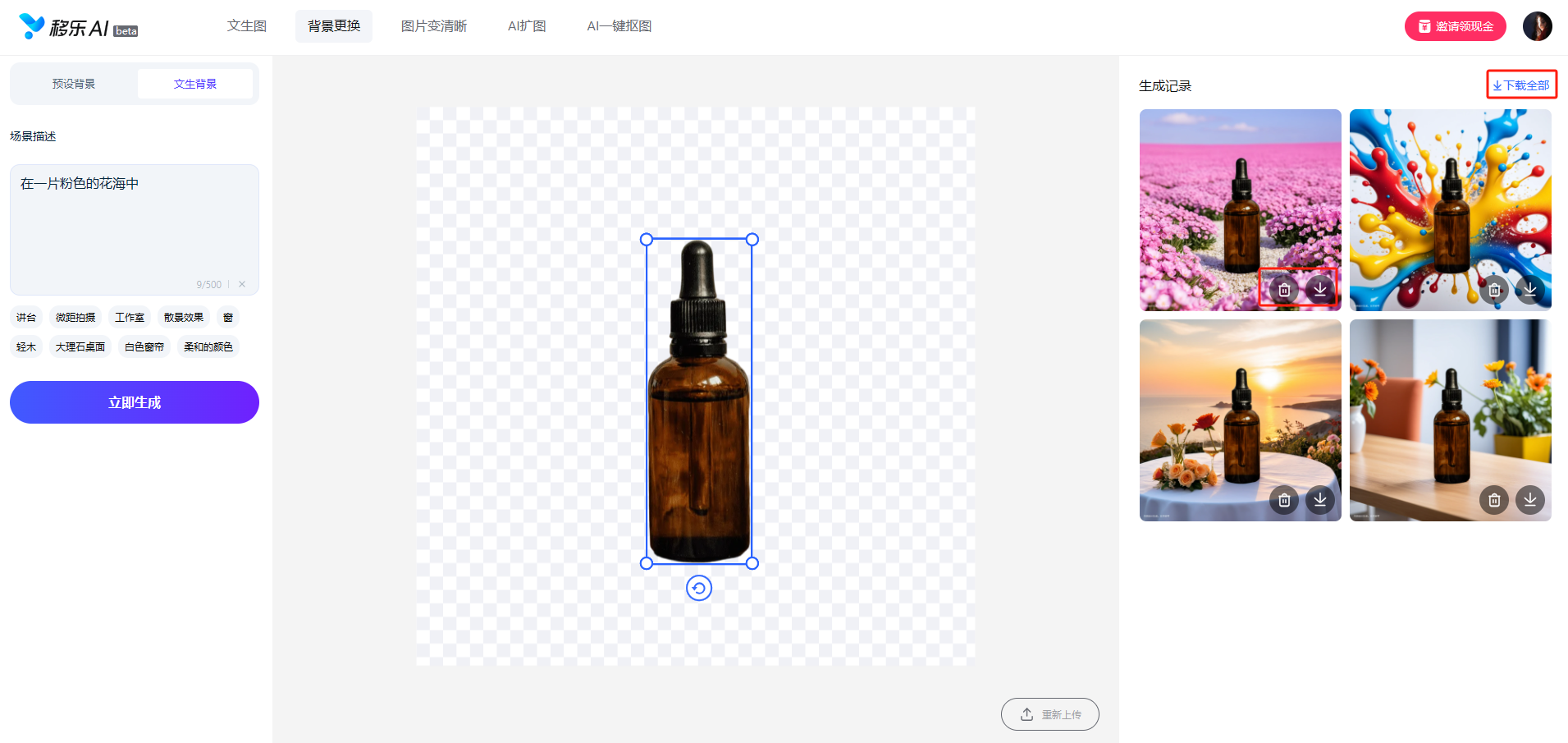 3.添加背景:从左侧【预设背景】中选择合适的背景,或在【文生背景】下输入需要的背景描述文字,点击【立即生成】,右侧将会出现图片生成记录,点击图片可放大查看生成效果。也可以执行删除或下载已更换背景的图片操作,支持一键下载全部