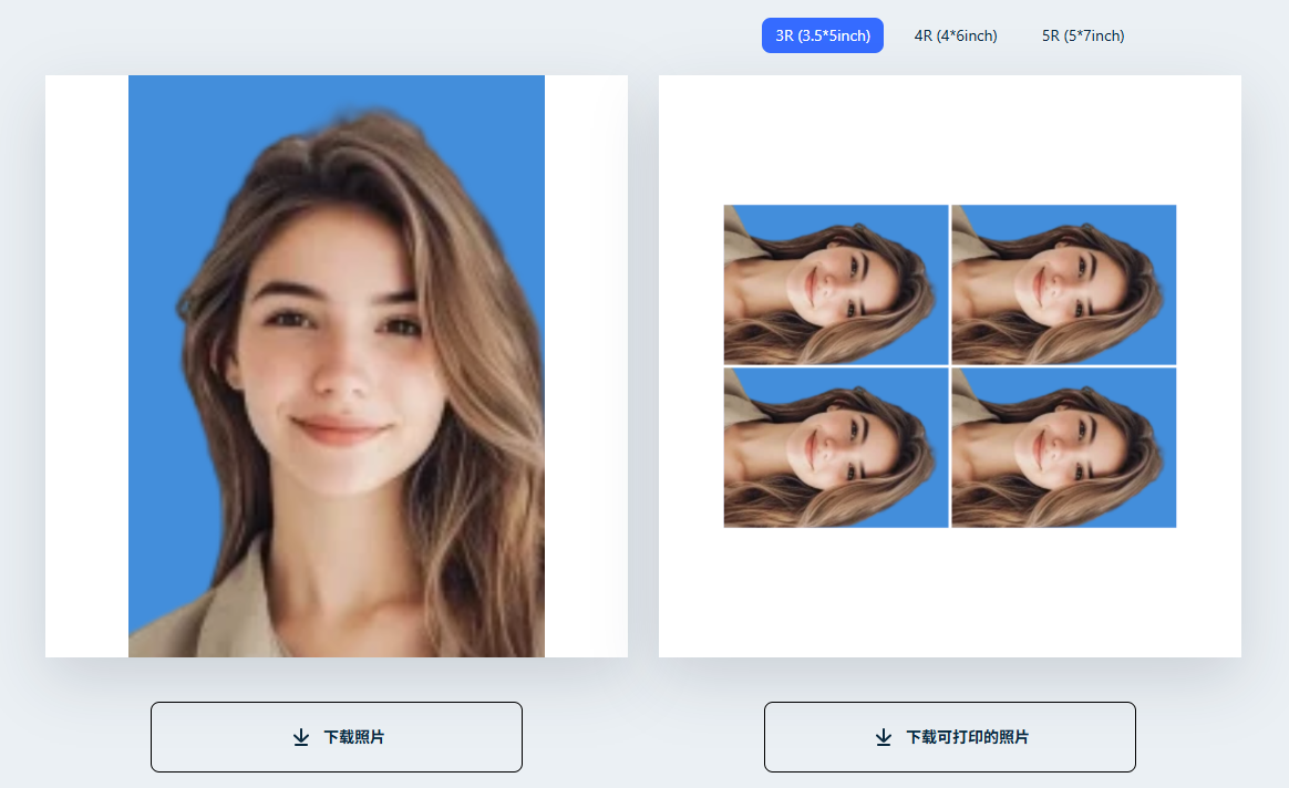 3.预览与下载:等待一会儿,AI就会生成符合标准的证件照。预览满意后,点击“下载数位照片”或“下载可打印的照片”按钮,即可免费下载照片。
