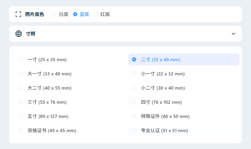 线上系统通常要求以像素为单位,如“295px×413px(一寸,300dpi)”。专业的“蓝底证件照一键生成”工具会内置数十种标准尺寸模板供您一键选择。