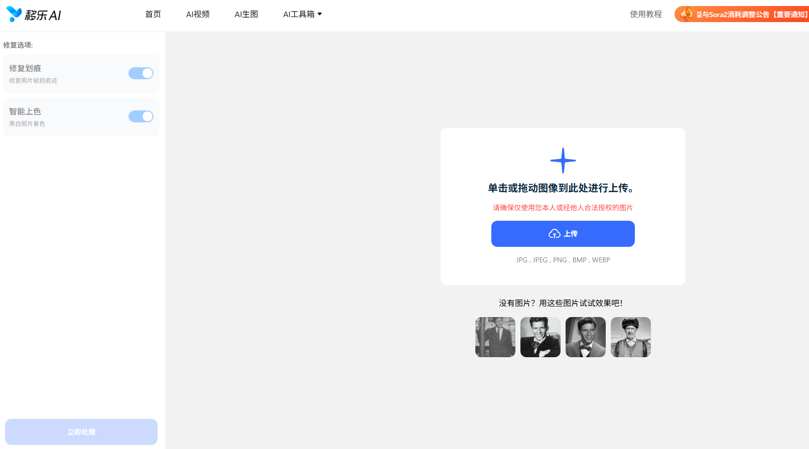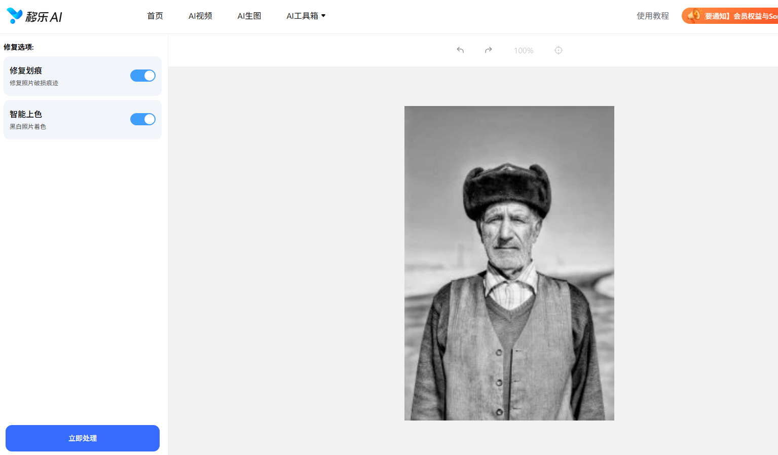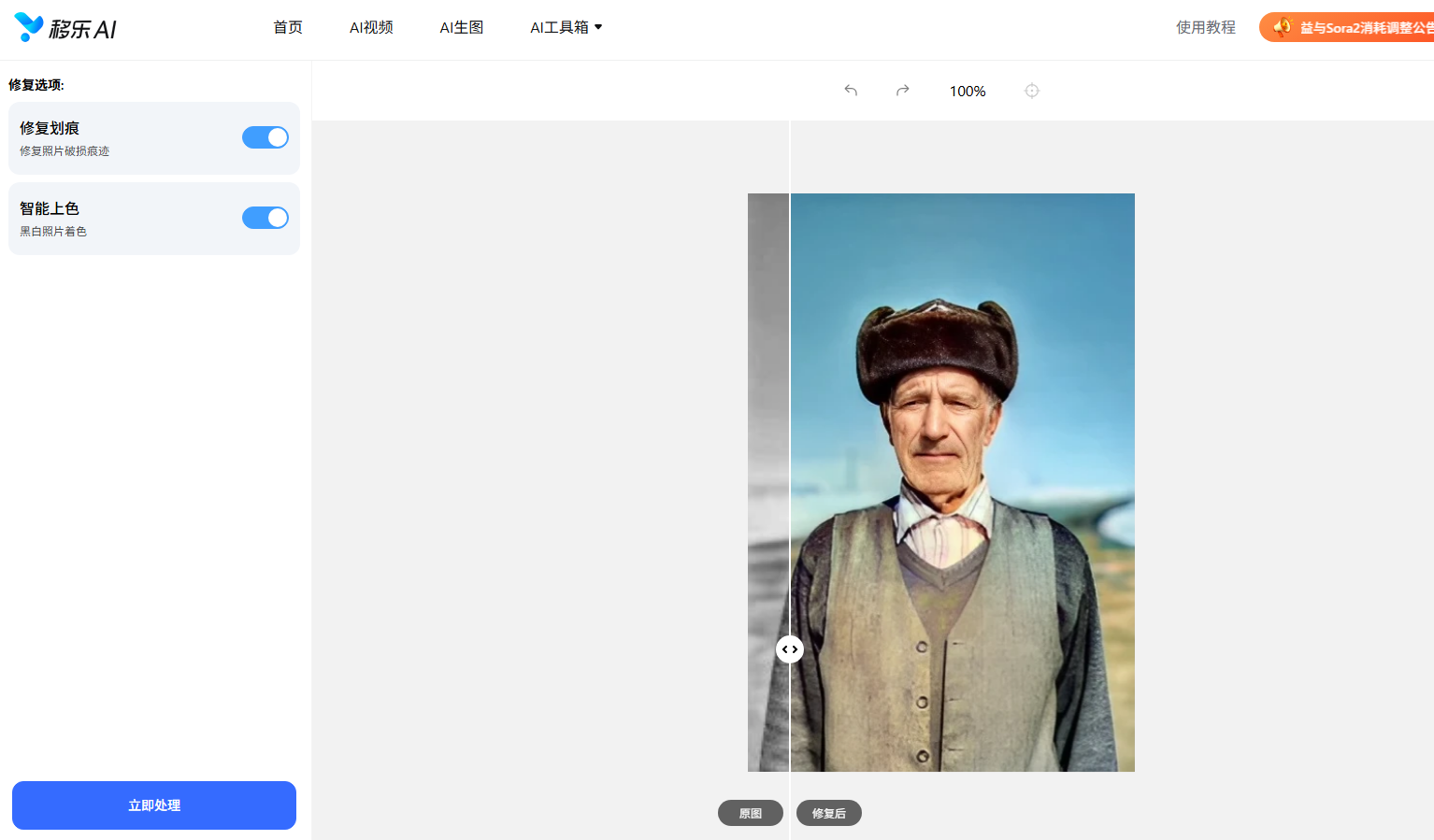 第三步:最后,点击“立即处理”按钮,等待AI自动修复照片即可。