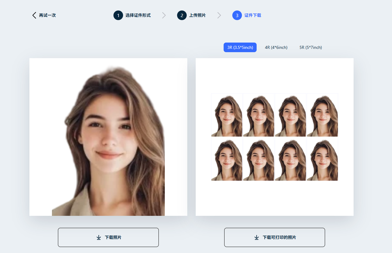 3.预览与下载:等待一会儿,AI就会生成符合标准的证件照。预览满意后,点击“下载数位照片”或“下载可打印的照片”按钮,即可免费下载照片。